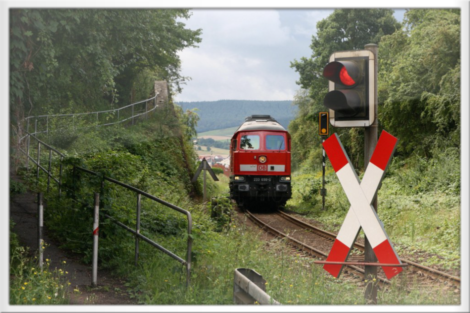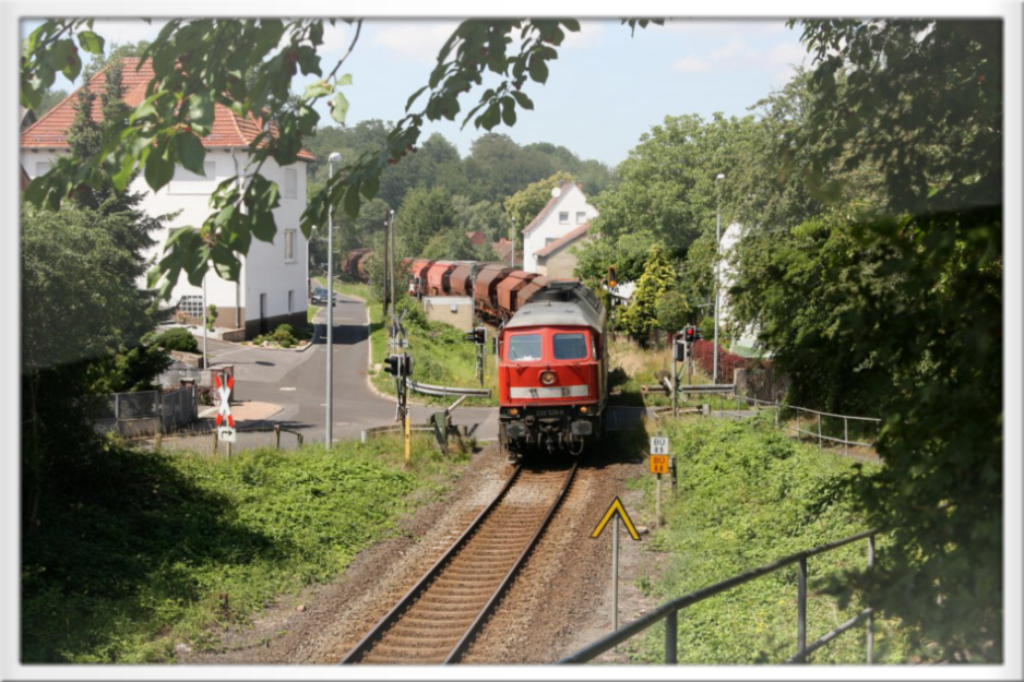 Ein Kalizug passiert den Bahnübergang Bornbergstrasse in Widdershausen, links das Bahnpfädchen zur Kiesgrube
