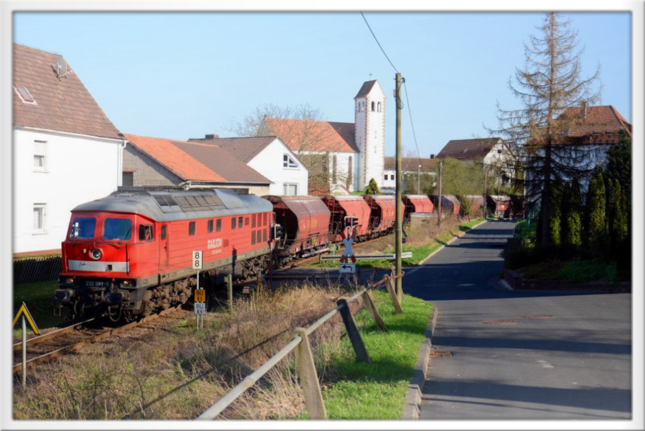 Ein Kalizug aus Heringen kommend, passiert gerade den Standort des alten Bahnhofs in Richtung Dankmarshausen.