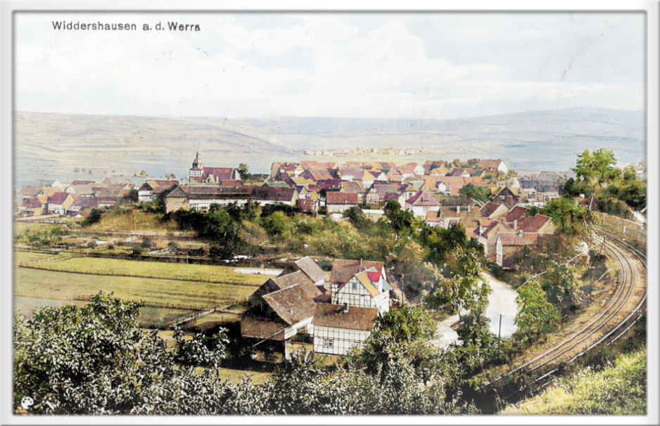 Widdershausen auf einer Postkarte von 1928, die beiden Gleise der Werratalbahn sind sehr gut zu sehen