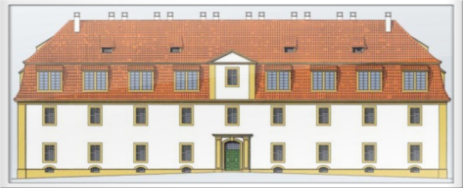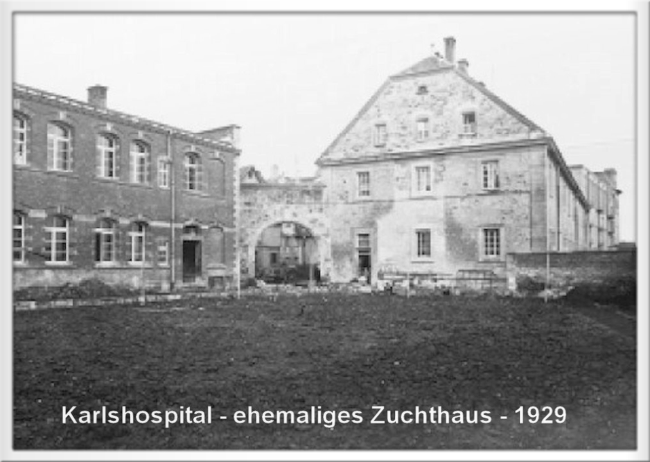 Arbeits- und Zuchthaus machen einen und zwar den linken und mittleren hinteren Querflügel des Hospitalgebäudes aus, und ersteres, welches den unteren Flügel desselben einnimmt, ist von dem Arbeitshause, obschon beide unter einem Dache stehen, doch getrennt.