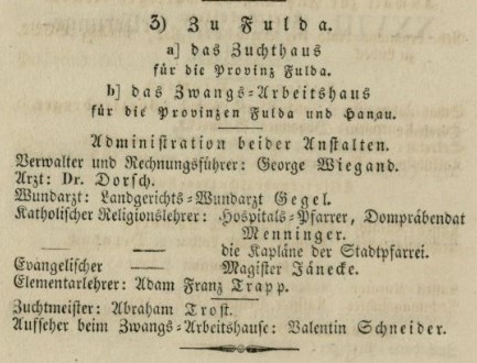 Das Zwangsarbeitshaus in Fulda geht zurück auf das mit Verordnung vom 28.7.1766 gegründete und im Heilig-Geist-Hospital eingerichtete Zucht- und Arbeitshaus. Es nahm nur strafrechtlich verurteilte Personen auf, gleichzeitig sollte es der Abstellung des Müßiggangs und der Bettelei dienen. In der nassau-oranischen Zeit wurde im Jahre 1804 zusätzlich ein Arbeits- und Korrektionshaus zur Armenversorgung eingerichtet. Darüber hinaus lässt sich im Jahre 1816 noch ein Stockhaus (mit nur einem Insassen) nachweisen.