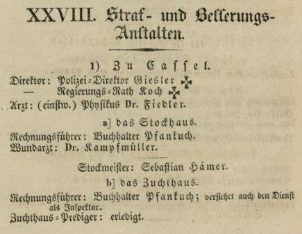 Im 19. Jahrhundert standen im Kurfürstentum Hessen zur Aufnahme rechtskräftig verurteilter Personen sechs sogenannte „Straf- und Besserungsanstalten“ zur Verfügung. Es handelte sich hierbei um die zwei „Zwangsarbeitshäuser“ in Fulda und Ziegenhain, die zwei „Zuchthäuser“ in Kassel – namentlich das Zuchthaus in der Stadtkaserne und das Zuchthaus an der Fulda (Karlshospital) – und die zwei „Stockhäuser“ in Kassel und Marburg.