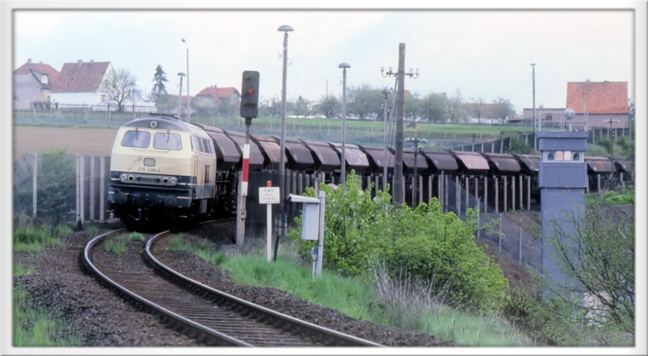 Kurz hinter einem Fahrweg, der unter dem Bahndamm hindurchführte und im Westen lag, verlief die Grenze quer über den Bahndamm. Der Bahnverkehr war hier nicht wie an anderen Bahnlinien unterbrochen, den wegen des Kalibergbaues verkehrten hier laufend Güterzüge über die Grenze hinweg. Die kritische Stelle war selbstverständlich rund und die Uhr von der DDR aus streng bewacht und gesichert.
