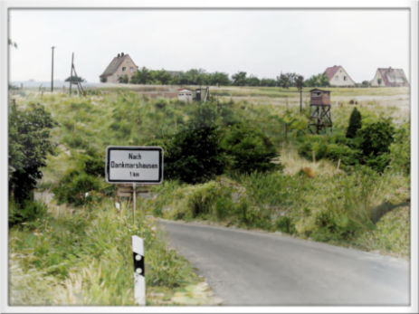 Die alte Zonengrenze zwischen Widdershausen und Dankmarshausen in den 1960er Jahren, im Hintergrund ein alter Beobachtungsturm der Grenztruppen aus Holz und die ersten Häuser von Dankmarshausen auf dem Diesberg